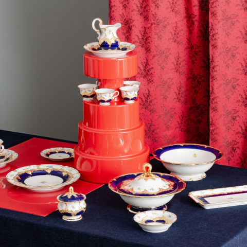 이 유럽식 식사 문화의 걸작은 호화스럽고 감청색으로 빛나는, 23캐럿 금 코팅의 정교한 양각 부조 작품입니다.