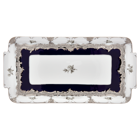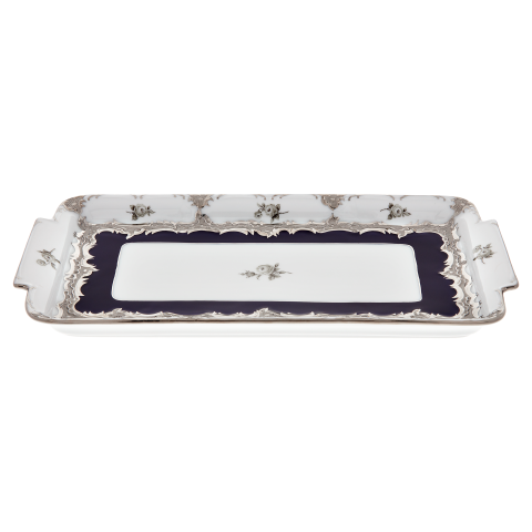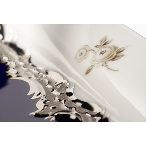 로얄 블루 유약과 아름다운 흩어진 장미 데코에 화려한 백금을 입혀 황홀하게 만듭니다.