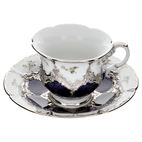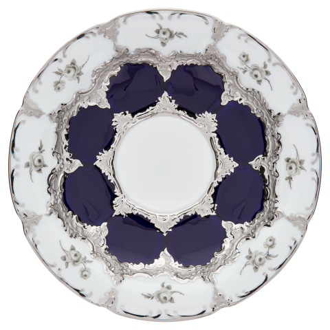 로얄 블루 유약과 아름다운 흩어진 장미 데코에 화려한 백금을 입혀 황홀하게 만듭니다.