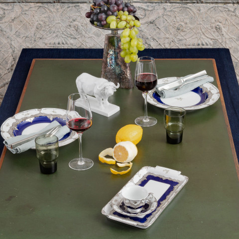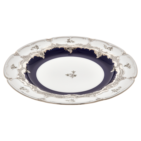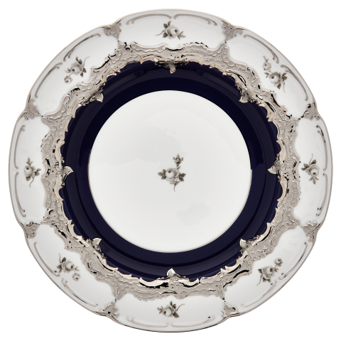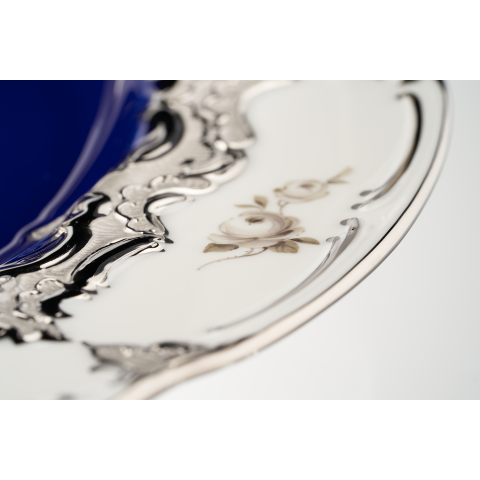 디너 플레이트는 로얄 블루 유약과 아름다운 흩어진 장미 데코에 화려한 백금을 입혀 황홀하게 만듭니다.
