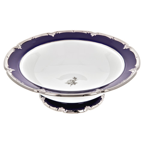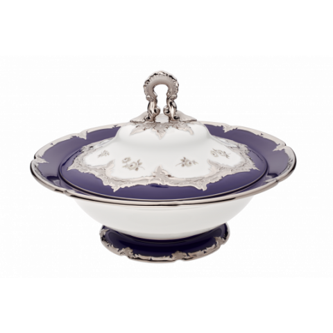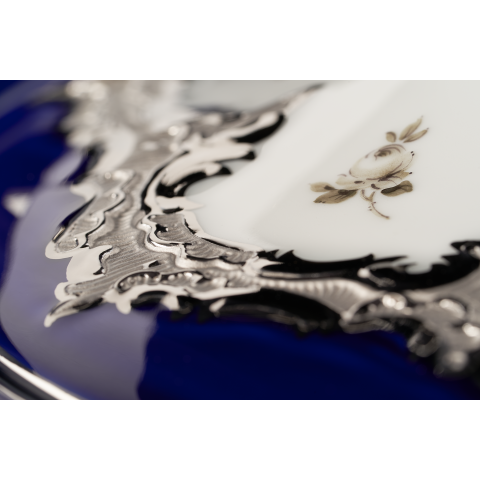 뚜껑볼은 로얄 블루 유약과 아름다운 흩어진 장미 데코에 화려한 백금을 입혀 황홀하게 만듭니다.