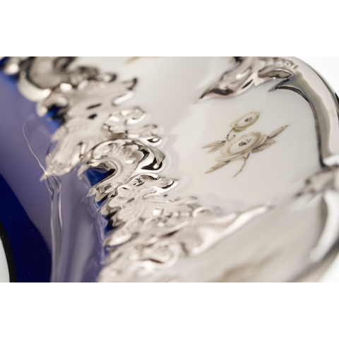 로얄 블루 유약과 아름다운 흩어진 장미 데코에 화려한 백금을 입혀 황홀하게 만듭니다.