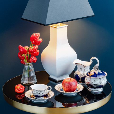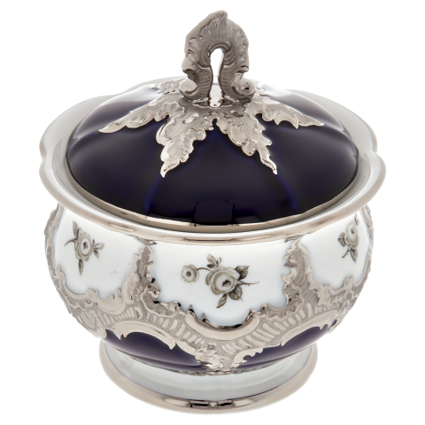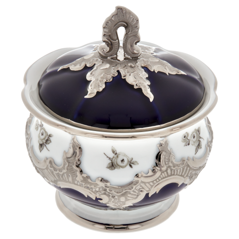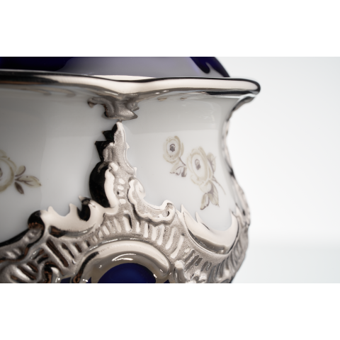 로얄 블루 유약과 아름다운 흩어진 장미 데코에 화려한 백금을 입혀 황홀하게 만듭니다.