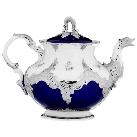 로얄 블루 유약과 아름다운 흩어진 장미 데코에 화려한 백금을 입혀 황홀하게 만듭니다.
