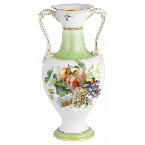 꽃다발은 제품의 반대편에 통통한 복숭아와 많은 포도송이로 증강되어 표현되었습니다. 꽃병의 목에 표현된 나비와 곤충들이 그 장면에 커다란 활기를 불어넣고, 땅은 여름철의 녹색으로 손수 표현했습니다. 꽃과 과일을 장식하는 데 여러번의 소성이 필요하며, 이를 통해 메이센 그림이 전 세계에서 칭송받아지게 여겨지는 색채의 탁월함과 화려함을 얻습니다.