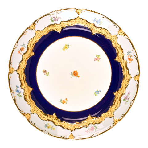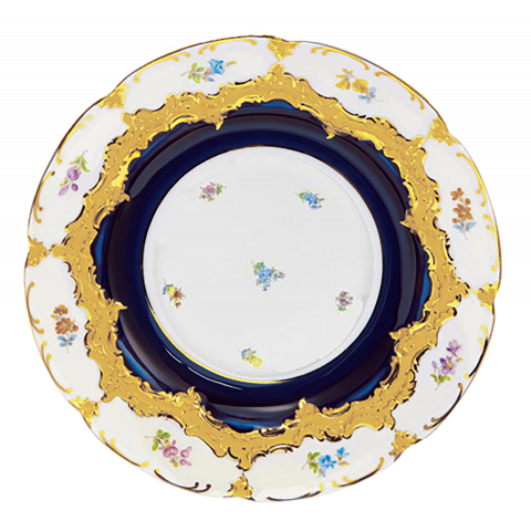 이 유럽식 식사 문화의 걸작은 호화스럽고 감청색으로 빛나는, 23캐럿 금 코팅의 정교한 양각 부조 작품입니다.