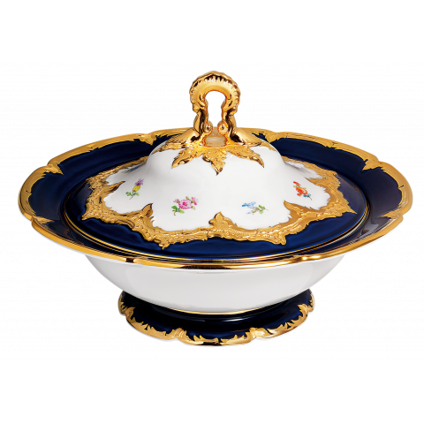 이 유럽식 식사 문화의 걸작은 호화스럽고 감청색으로 빛나는, 23캐럿 금 코팅의 정교한 양각 부조 작품입니다.