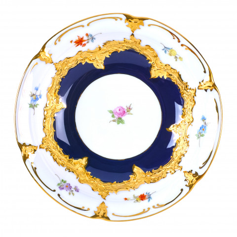 이 유럽식 식사 문화의 걸작은 호화스럽고 감청색으로 빛나는, 23캐럿 금 코팅의 정교한 양각 부조 작품입니다.