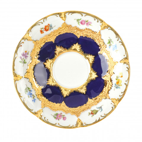 이 유럽식 식사 문화의 걸작은 호화스럽고 감청색으로 빛나는, 23캐럿 금 코팅의 정교한 양각 부조 작품입니다.