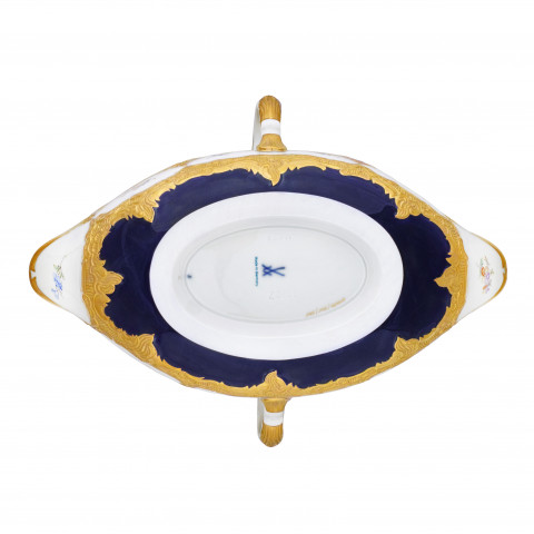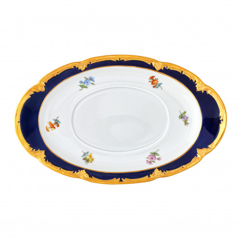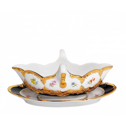 이 유럽식 식사 문화의 걸작은 호화스럽고 감청색으로 빛나는, 23캐럿 금 코팅의 정교한 양각 부조 작품입니다.