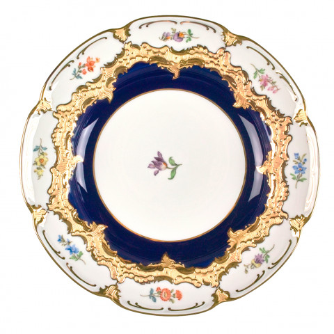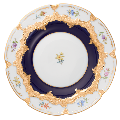 이 유럽식 식사 문화의 걸작은 호화스럽고 감청색으로 빛나는, 23캐럿 금 코팅의 정교한 양각 부조 작품입니다.
