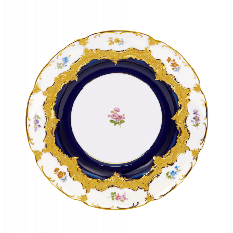 이 유럽식 식사 문화의 걸작은 호화스럽고 감청색으로 빛나는, 23캐럿 금 코팅의 정교한 양각 부조 작품입니다.