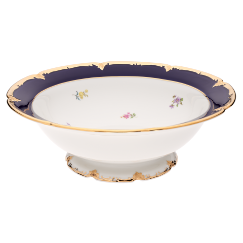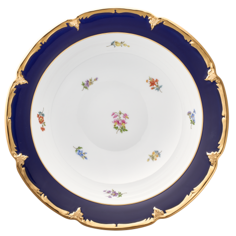 이 유럽식 식사 문화의 걸작은 호화스럽고 감청색으로 빛나는, 23캐럿 금 코팅의 정교한 양각 부조 작품입니다.