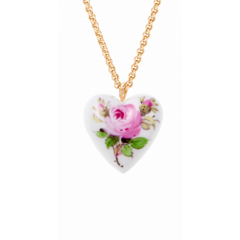 펜던트 “Heart Rose”는 하트 모양의 마이센 도자기 위에 손으로 그린 장미 장식을 보여줍니다