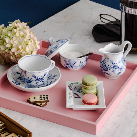 당시 주로 푸른색이 주를 이루던 동아시아의 패턴에서 영감을 얻은 Meissen"Onion Pattern"은 1731년에 만들어져 전 세계적으로 유명해졌습니다이 패턴의 "Onion"은 실제로 양파가 아니라 가장자리의 복숭아와 멜론 중앙의 대나무 줄기 와 국화꽃입니다.