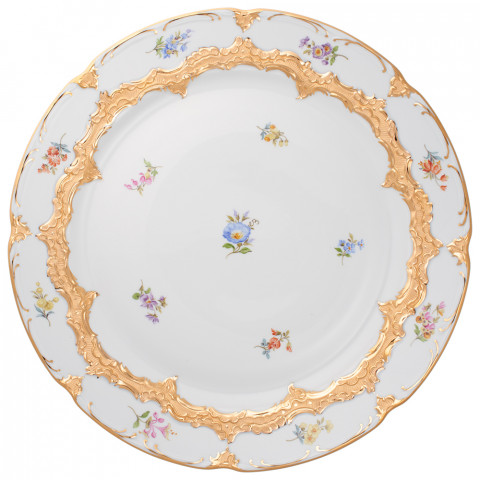 이 유럽식 식사 문화의 걸작은 호화스럽고 감청색으로 빛나는, 23캐럿 금 코팅의 정교한 양각 부조 작품입니다.