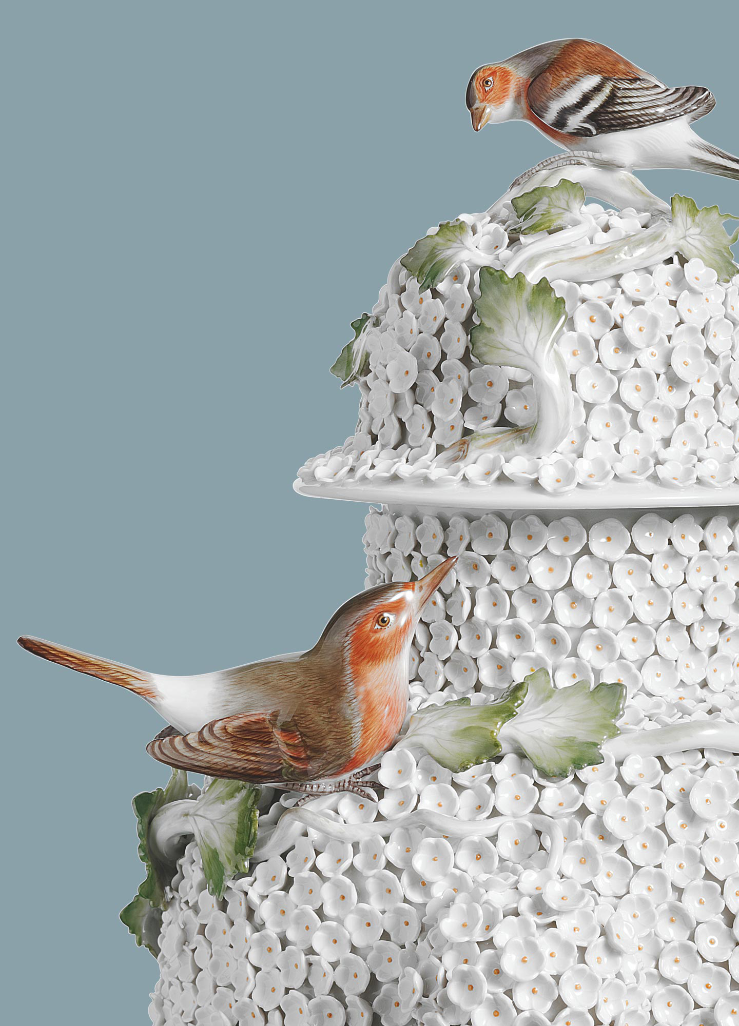 꽃 장식은 컵, 꽃병 및 상자에 풍부하게 적용되어 겨우 30년 전에 설립된 유럽 최초의 도자기 회사의 세공사, 화가 및 가마 장인에게 특별한 도전을 제기했습니다. 눈꽃 송이 하나하나를 수공으로 만들고 뾰족한 기구로 용기에 바르고 개별적으로 손으로 페인팅합니다. Meissen은 창립 직후 “눈송이 꽃”을 통해 유럽의 다른 도자기 회사들에게 흔적을 남길 도자기 디자인에 대한 새로운 미적 및 기술적 표준을 제시할 수 있었습니다.